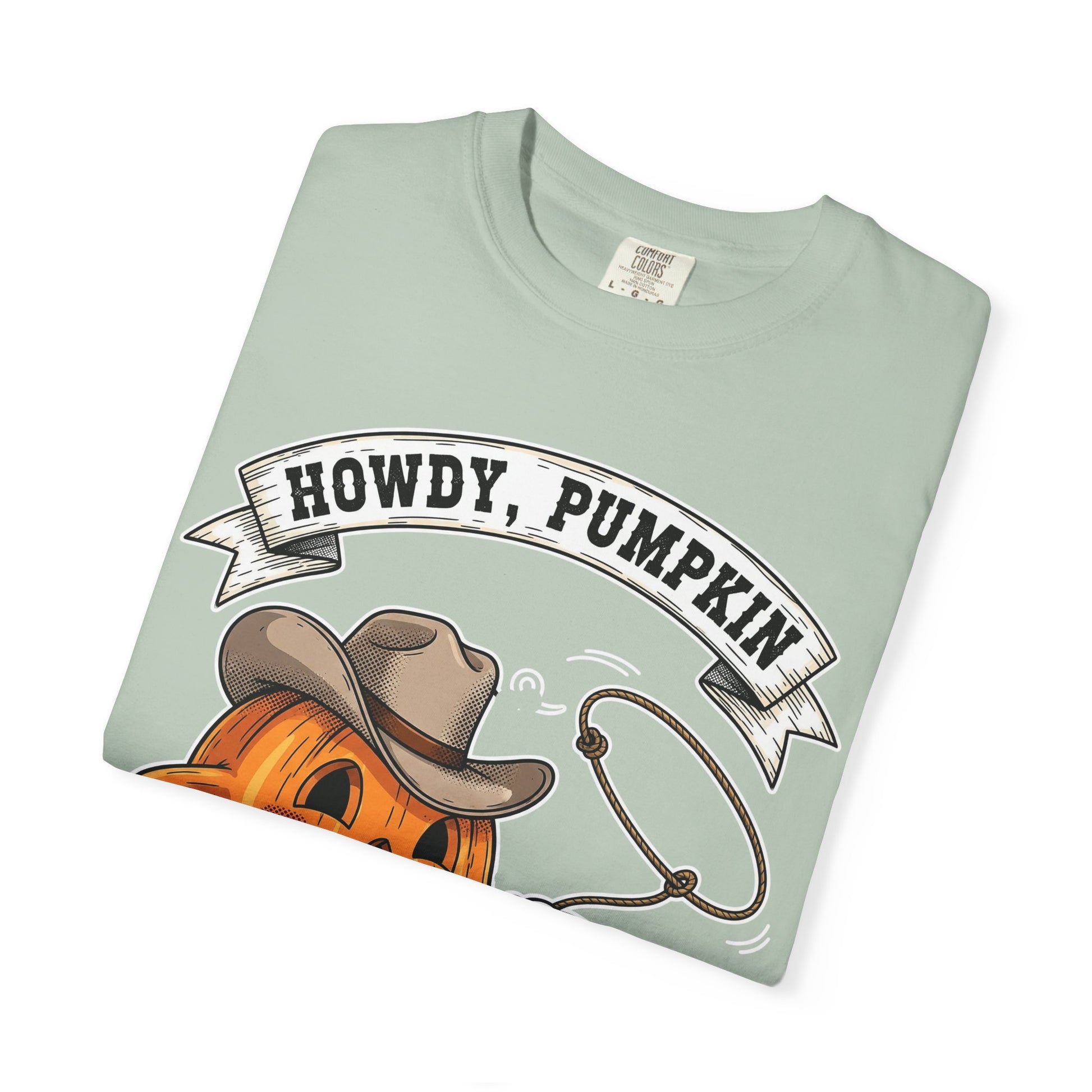 Howdy Pumpkin T-Shirt for Fall, Unisex Garment-Dyed Tee, Halloween Apparel, Autumn Fashion, Cowboy Style Shirt, Seasonal Gift