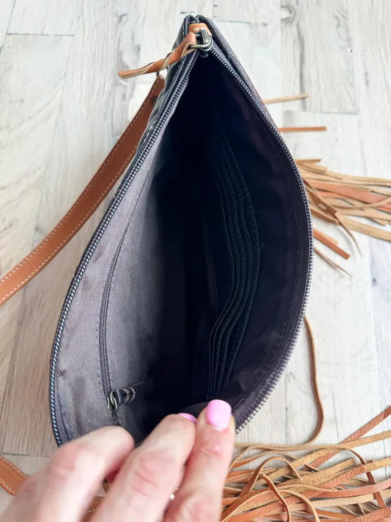 This stunning purse offers the ideal size and versatile style, functioning as a clutch, handbag, crossbody, or shoulder bag. Crafted from 100% genuine premium leather, it features quilted leather on both front and back, with hand-painted details and leather fringe accents. The main compartment comfortably fits essentials like keys, wallet, phone, and makeup, secured by a zipper closure. Inside, you'll find a zippered pocket, eight credit card slots, and a fabric lining. The adjustable, removable strap allows for multiple carry options. Dimensions: 11" wide x 9" long x 2" deep, expandable with fringe. Each piece is unique due to natural leather characteristics.