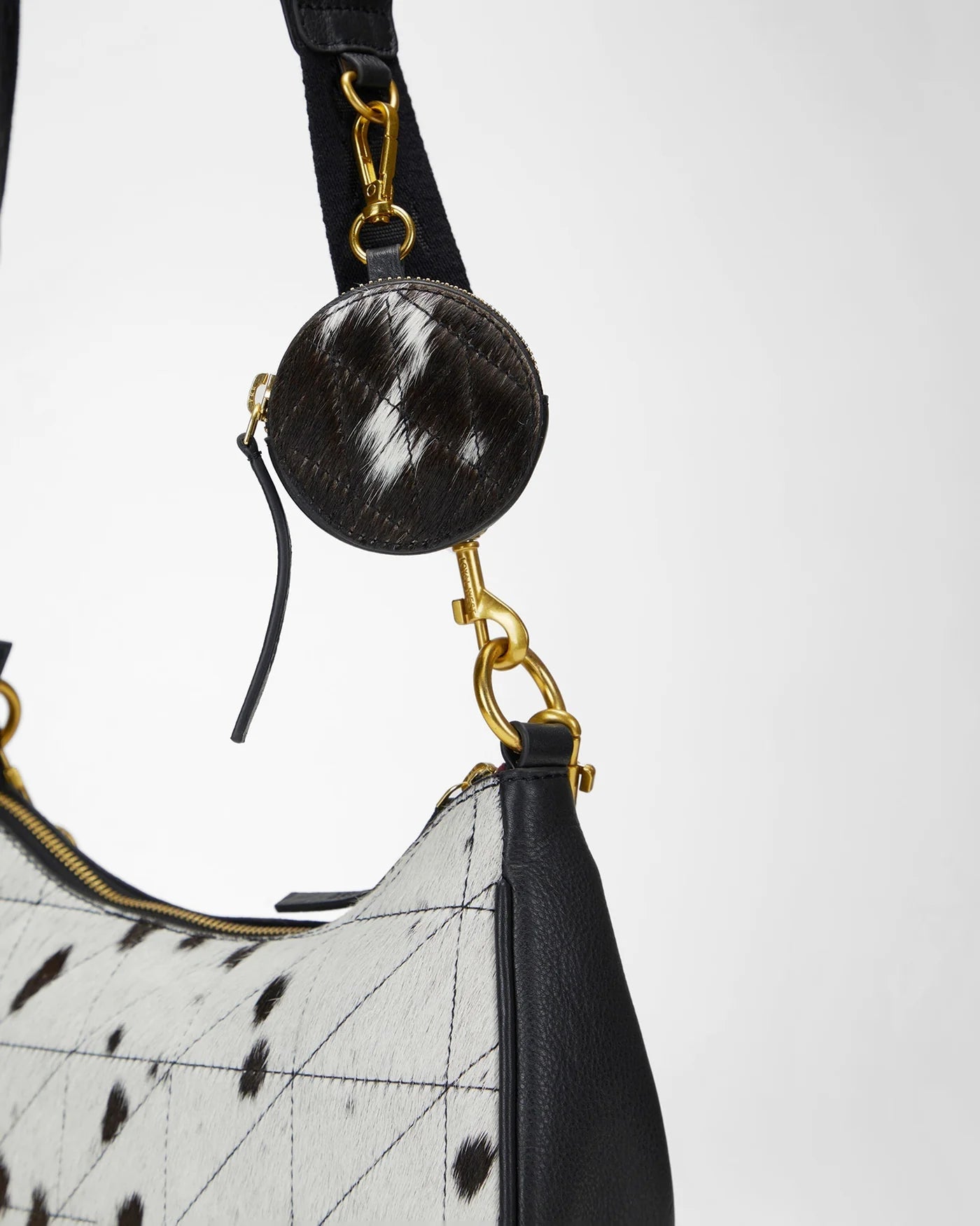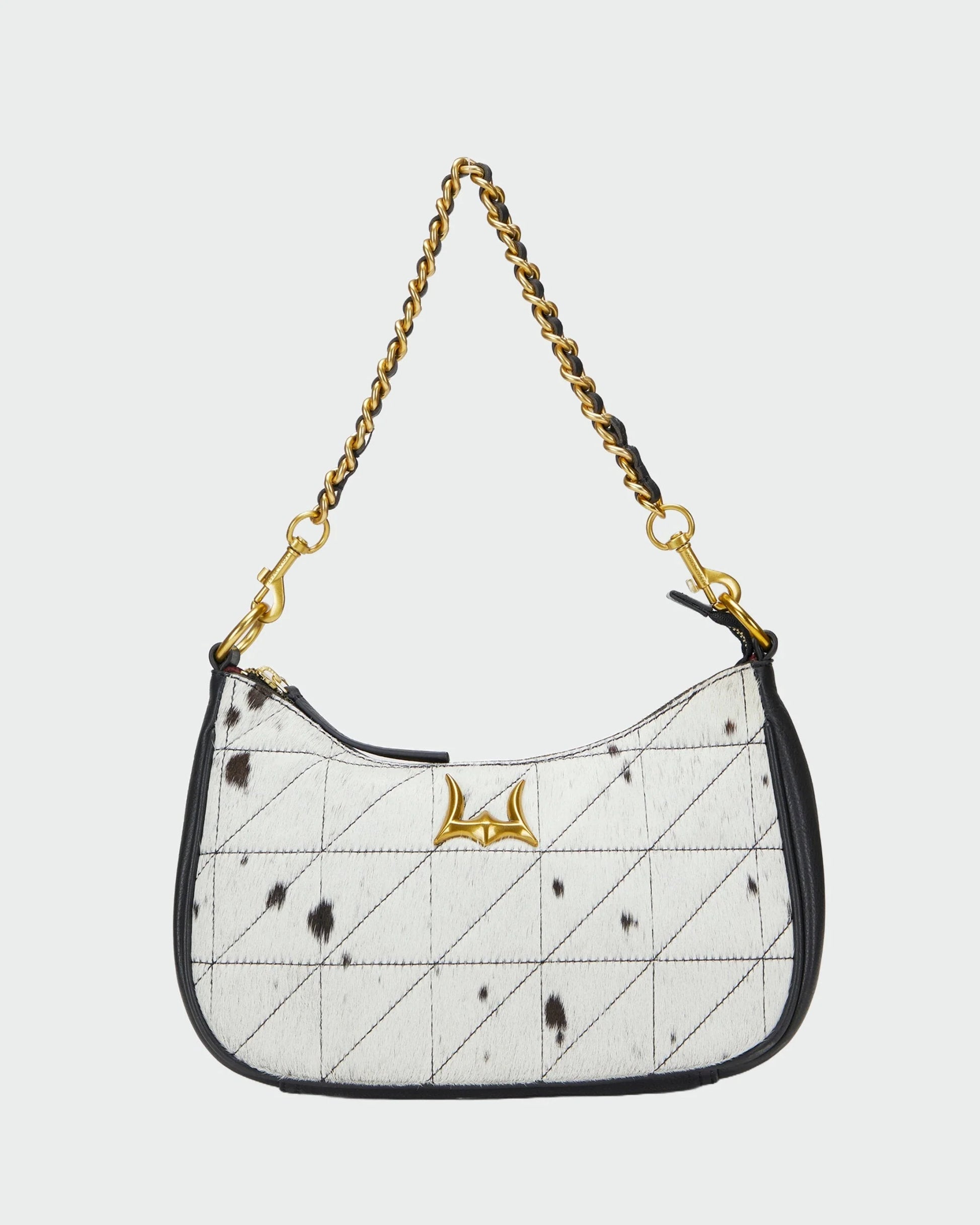 The Loyal West Joe Quilted Nappa Leather Bag in black and white cowhide seamlessly blends contemporary design with expert craftsmanship. Its distinctive quilted cowhide pattern offers a unique visual appeal, while the supple nappa leather ensures a sophisticated, tactile experience. Equipped with a durable strap and polished hardware, this bag balances elegance with functional durability, making it an ideal accessory for both everyday use and special occasions.